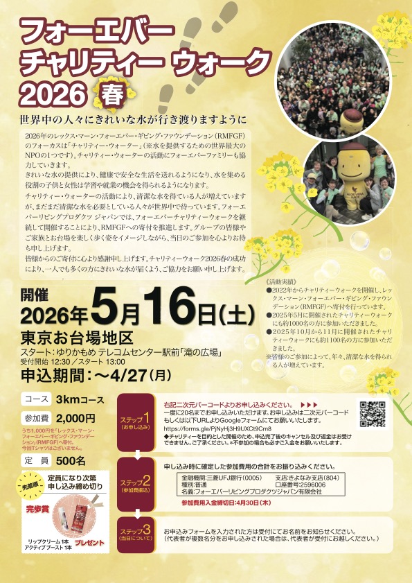 フォーエバーチャリティーウォーク2026春は東京・お台場のシンボルプロムナード公園 滝の広場で5月に開催されるチャリティーウォーキングイベントで、参加費を通じて世界中の人々へきれいな水を届ける支援活動が行われます。