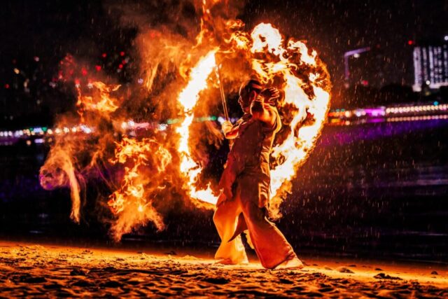 雷光炎舞「かぐづち-KAGUZUCHI-」が出演し、東京湾の水上でパフォーマンスを展開します。客席から約60m離れた海上という環境で、炎の熱量と最新テクノロジーを融合させた演出が予定されています。水上の炎に加え、空に舞い上がる12,000発の花火と800機のドローン、生演奏の弦楽アンサンブルが、1時間半の脚本に完全に同期して展開されます。