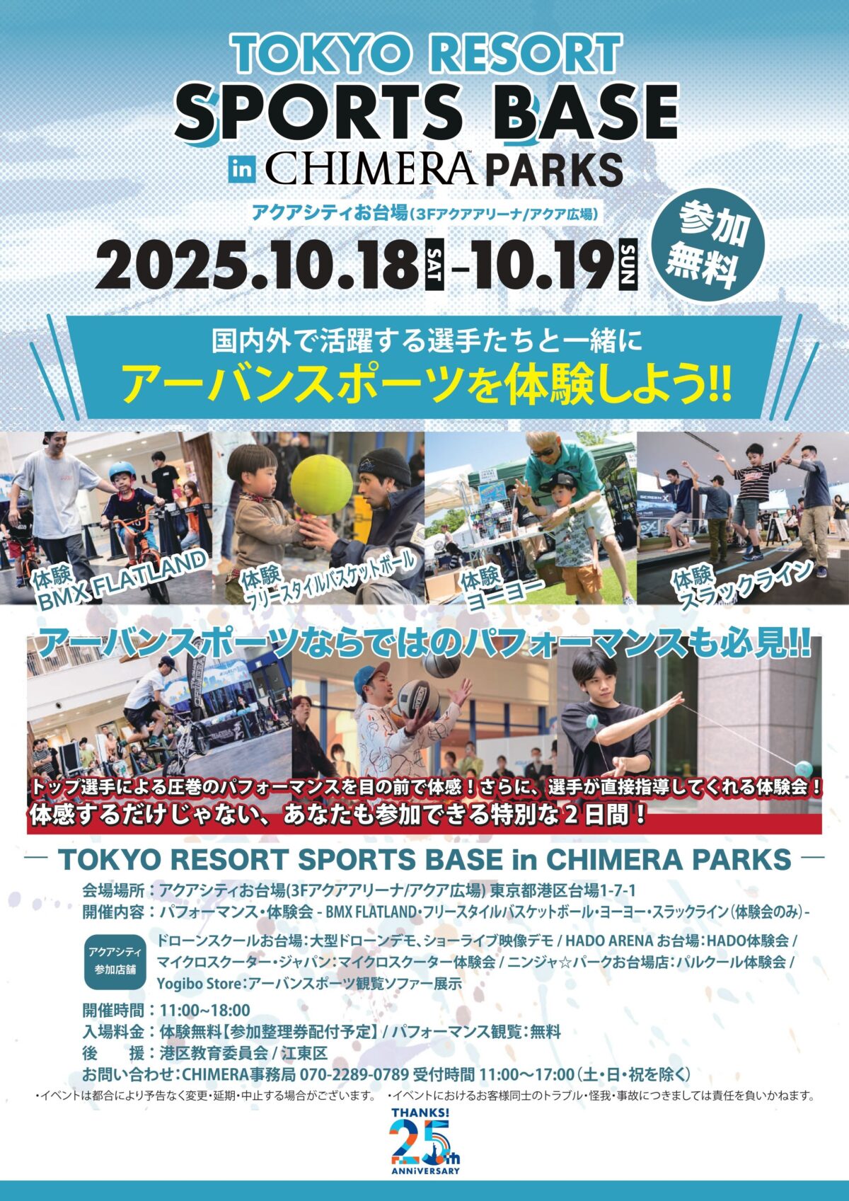 国内外で活躍するトップ選手たちと一緒に、アーバンスポーツを体験できる特別イベント「TOKYO RESORT SPORTS BASE in CHIMERA PARKS」が、アクアシティお台場で開催!BMX FLATLAND、フリースタイルバスケットボール、ヨーヨー、スラックラインなど、話題の競技を体験できるチャンス。選手による圧巻のパフォーマンスも必見で、参加無料。開放的なお台場で、家族や友人と一緒に思いきり体を動かして楽しもう!